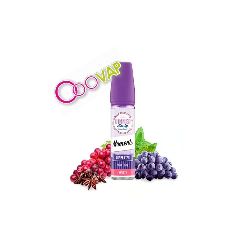 Dinner Lady Moments Grape Star. ¡La estrella del show! Una combinación de uvas rojas y negras ferozmente afrutadas, con un sutil toque de anís y un final refrescante a menta para un sabor completamente único.