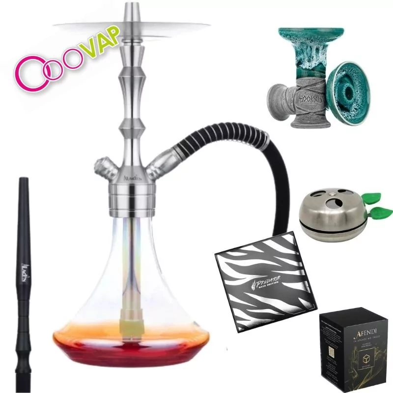El pack incluye cachimba Aladin MVP 340 Bottom Red, gestor de calor, papel de aluminio precortado, cazoleta y carbón, ofreciendo todo lo necesario para disfrutar desde el primer momento.
