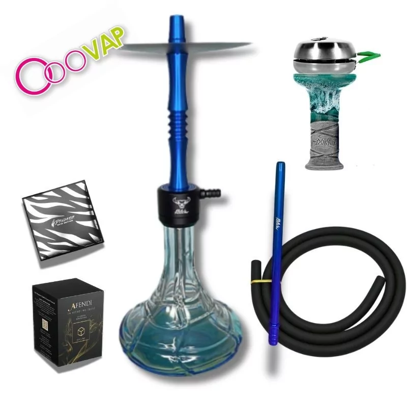 El pack incluye una cachimba Toro Blue Al Maydan, un modelo que destaca por su diseño llamativo y su excelente rendimiento en cada sesión. Su construcción sólida y su funcionamiento estable la convierten en una opción ideal tanto para usuarios que se inician como para aficionados que buscan un equipo fiable y atractivo.