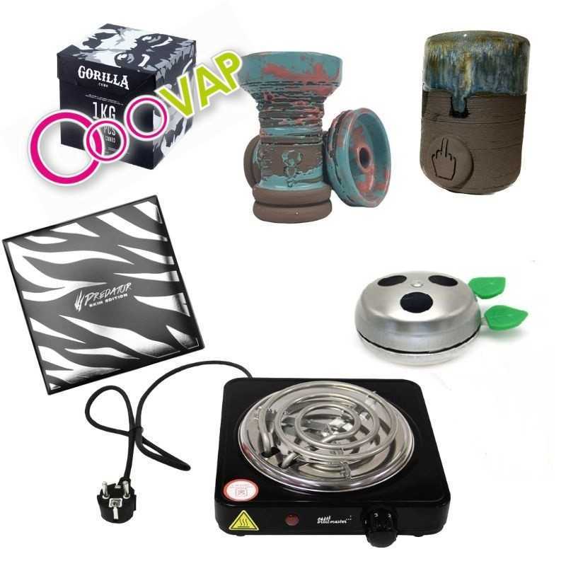 Fabuloso pack que incluye , una hornillo de 1000 w , 1 Kg de carbón Gorilla , una cazoleta bs, papel de aluminio predator 50 unidades y una Jarra de la marca old bowl para que acompañes tu shisha con tu bebida favorita .