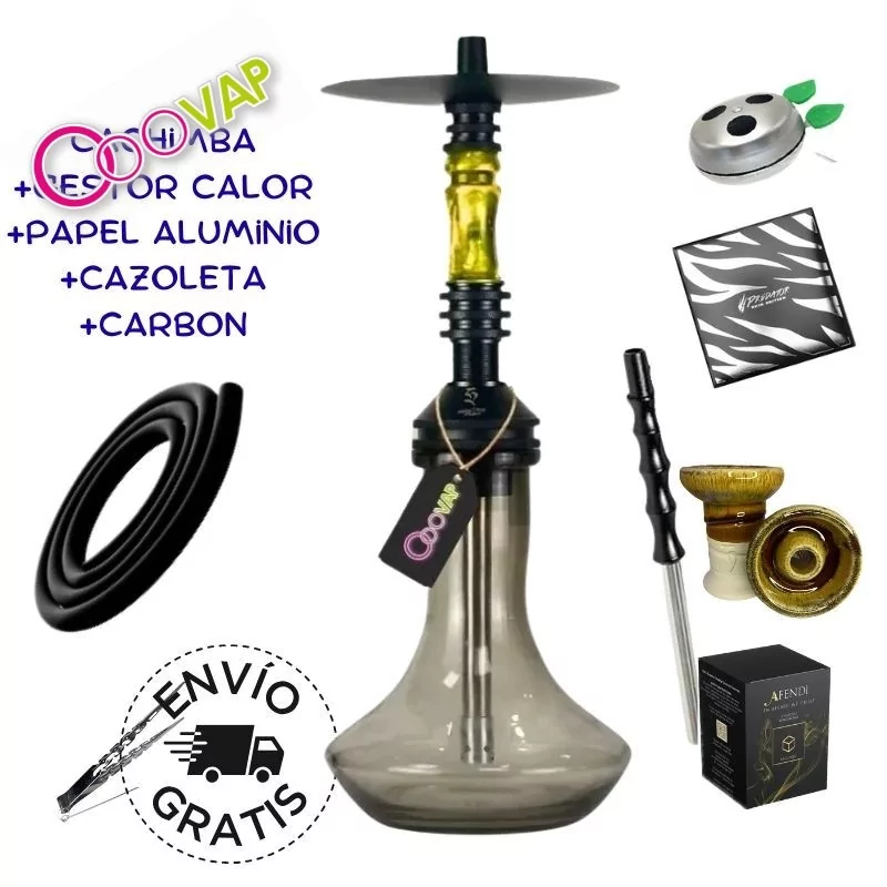 ✔️El Pack Cachimba Mantra Hookah yellow es ideal para iniciarte o mejorar tu setup. Incluye cachimba premium, 1 kg de carbón, gestor de calor, cazoleta y papel de aluminio Predator. ¡Un kit completo y listo para disfrutar!