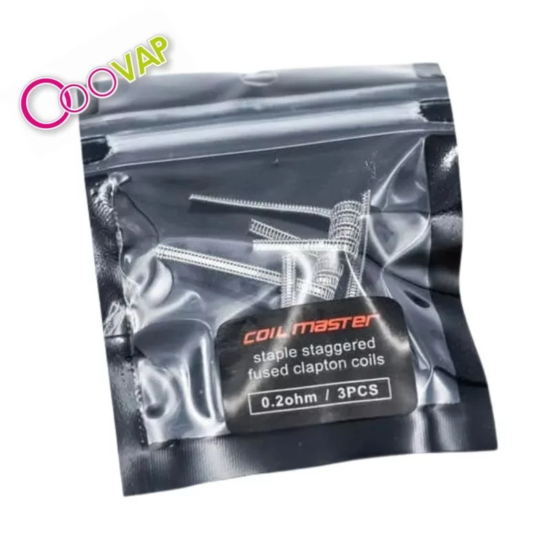 Resistencias Prebuilt Coil Master Staple Staggered Fused Clapton de 0,2 ohm, listas para montar y diseñadas para maximizar el sabor y la producción de vapor. Bolsa con 3 piezas, ideales para atomizadores reparables de alto rendimiento.