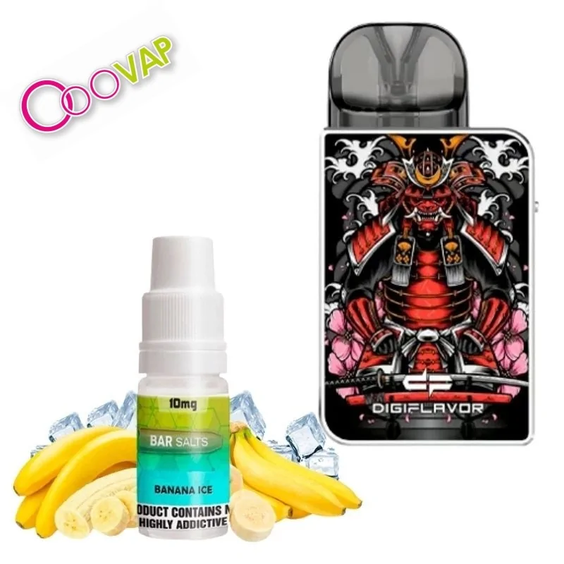 El Pack Ahorro Vapeo Digi-U Pod Samurai + Bar Nic 10mg Banana 10ml es la opción perfecta para quienes buscan un kit completo, práctico y económico para empezar a vapear. Incluye el dispositivo Digi-U Pod Samurai junto con un e-liquid Bar Nic sabor Banana en formato sales de nicotina de 10 mg.